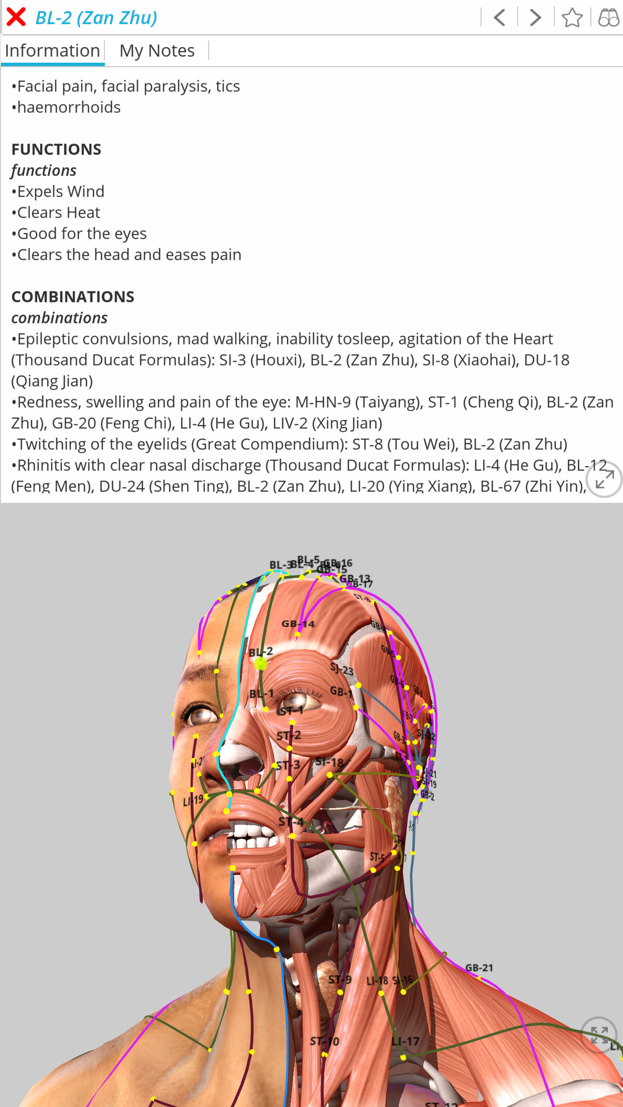 • Extensive acupoint database in 3D. Different names for a point incl Chinese and pinyin, effects, how to apply acupuncture and moxibustuon. I especially love that you can view points relative to bones and internal organs. Really great and useful app. Thank you for your effort. I would buy such an app...